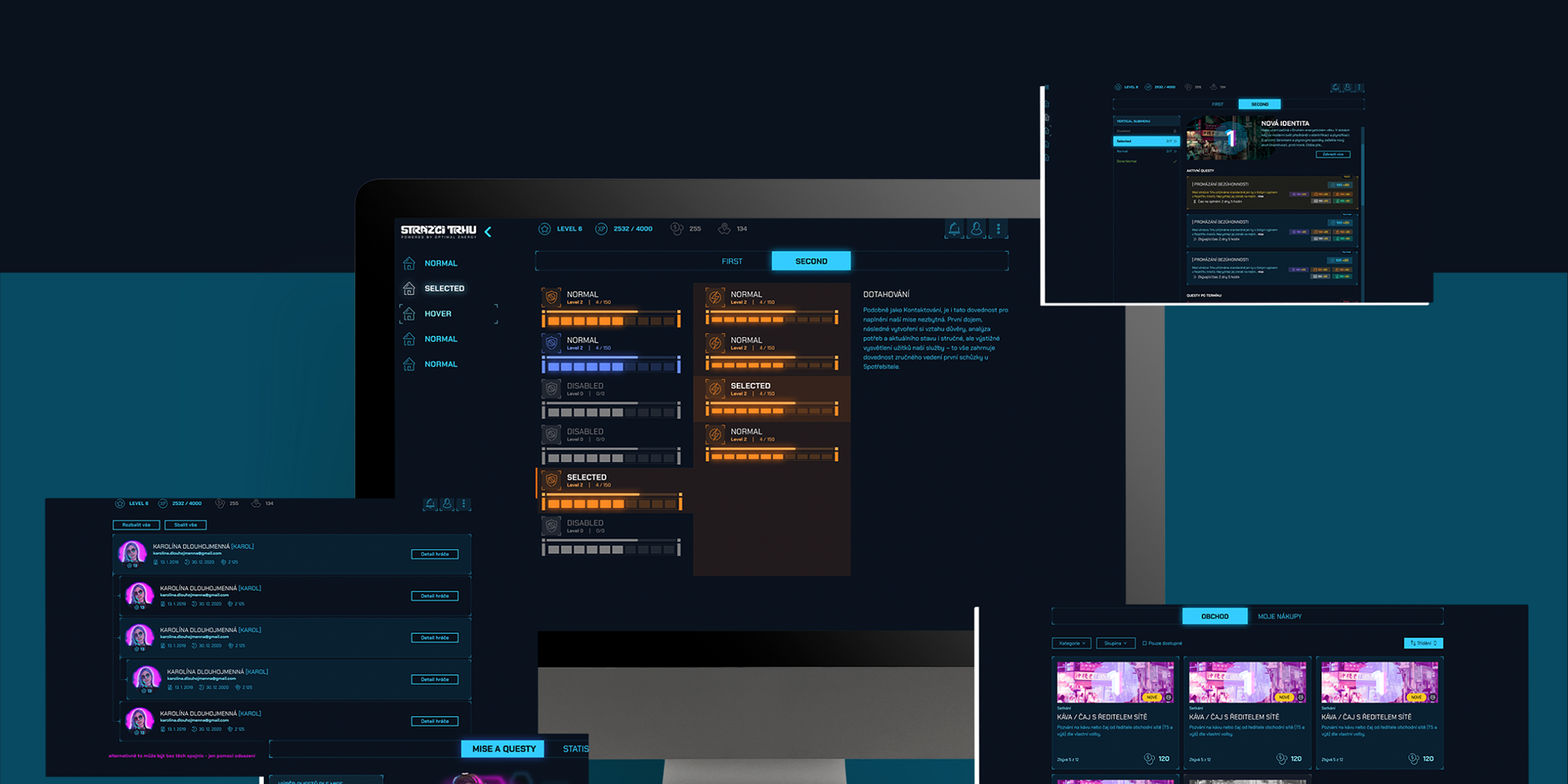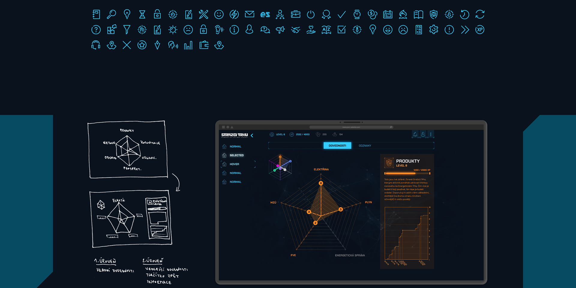 Logo, vizuální styl, UI design, sada ikon a ilustrace pro gamifikovanou zaškolovací aplikaci.
